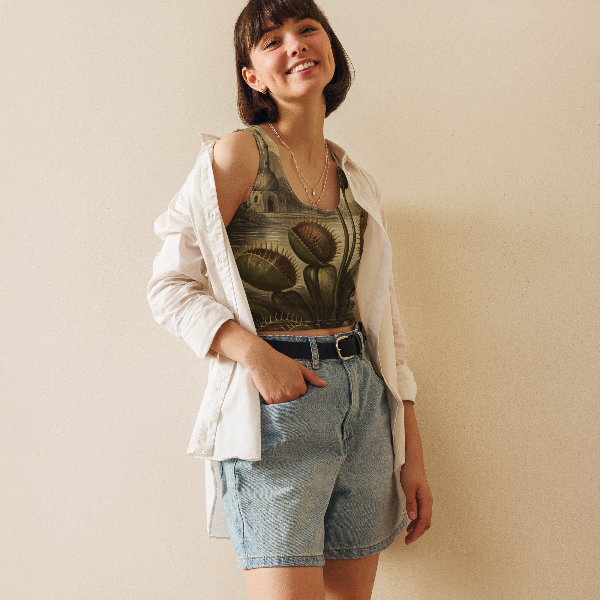 Look fabulous in an all-over printed, body-hugging crop top.